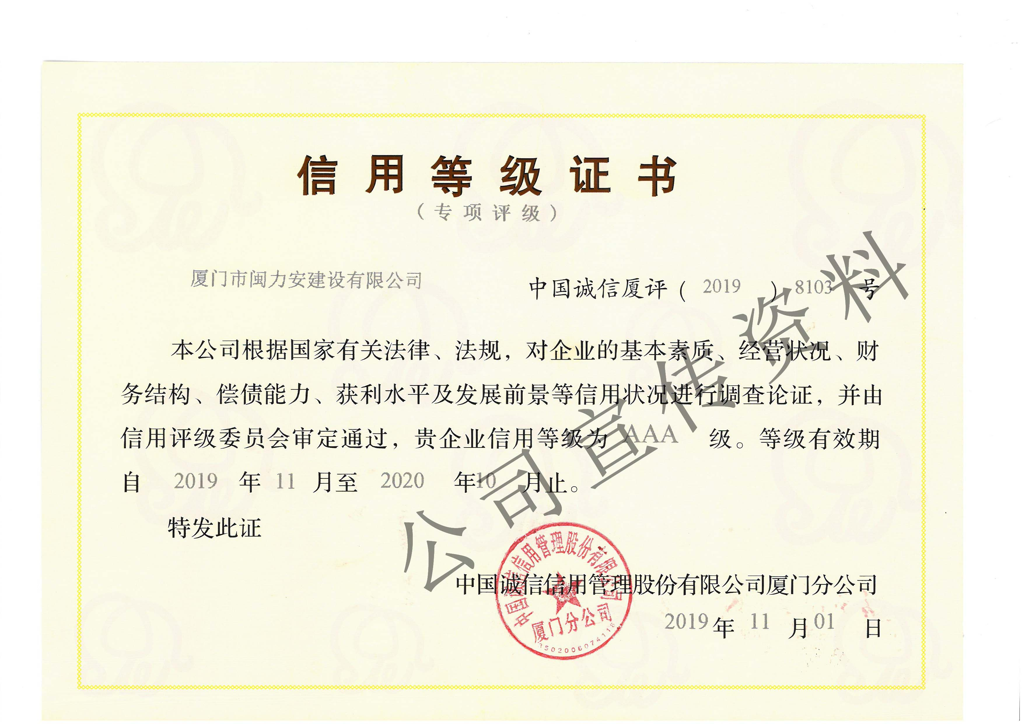 廈門市閩力安建設(shè)有限公司成立于2003年,公司取得市政公用工程施工總承包貳級、建筑裝修裝飾工程專業(yè)承包壹級、城市及道路照明工程專業(yè)承包壹級、電子與智能化工程專業(yè)承包貳級、消防設(shè)施工程專業(yè)承包貳級、電力工程施工總承包叁級、建筑機電安裝工程專業(yè)承包叁級、輸變電工程專業(yè)承包叁級、環(huán)保工程專業(yè)承包叁級、照明工程設(shè)計專項甲級、建筑裝飾工程設(shè)計乙級、施工勞務(wù)等資質(zhì)的綜合型企業(yè),公司于2013年通過了ISO9001質(zhì)量體系認(rèn)證,ISO14001環(huán)境管理體系認(rèn)證,OHSAS18001職業(yè)健康安全管理體系認(rèn)證。